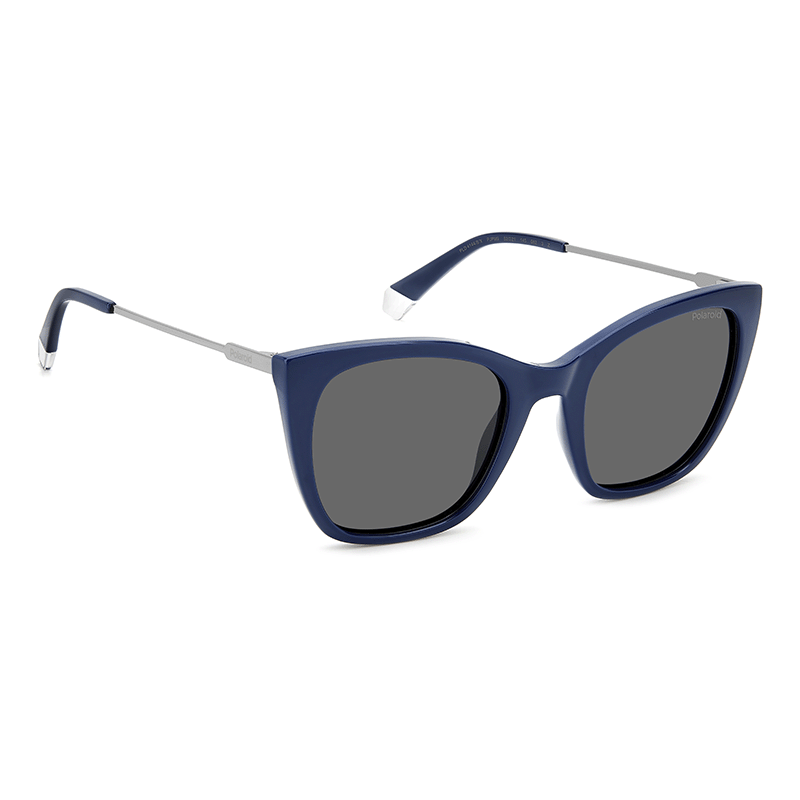 Estas gafas de sol con lentes RX-able y la montura combinada presentan un frente en forma de ojos de gato realizado en Tritan renew, para reflejar la elección material sostenible de la marca. Las varillas metálicas delgadas se personalizan con los terminales de color en contraste icónicos, una característica distintiva de Polaroid.