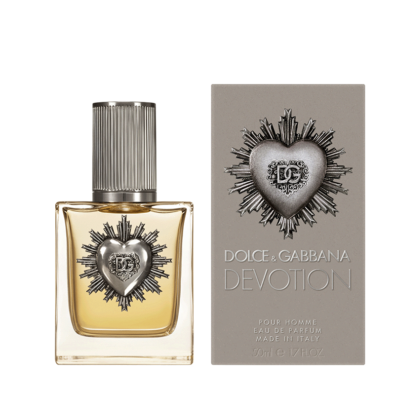 Devotion For Men presenta la misma silueta elegante que su contraparte femenina, reinterpretando sus códigos distintivos. La fragancia se encuentra envuelta en una botella adornada con el Sagrado Corazón en un plateado a juego, complementando el tapón.