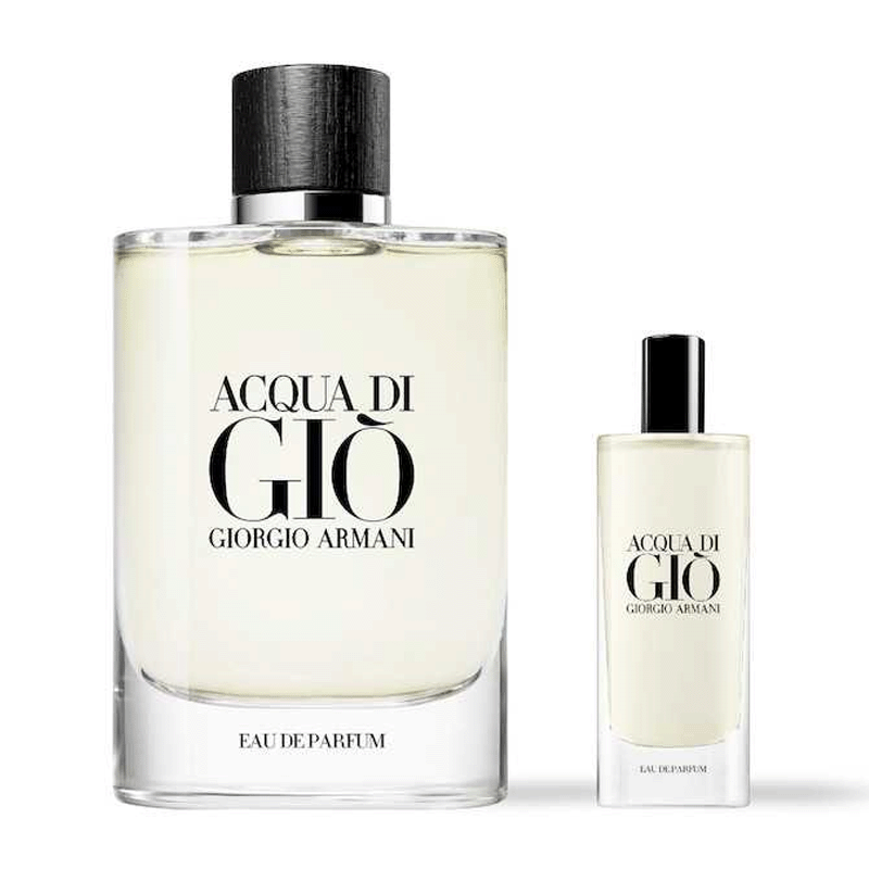 El estuche Acqua Di Gio Eau De Parfum combina notas frescas de mandarina verde y marinas con un corazón de salvia, geranio y lavanda, y un fondo cálido de pachulí y vetiver.