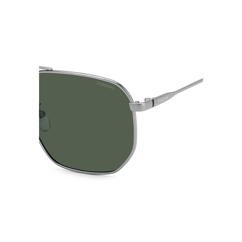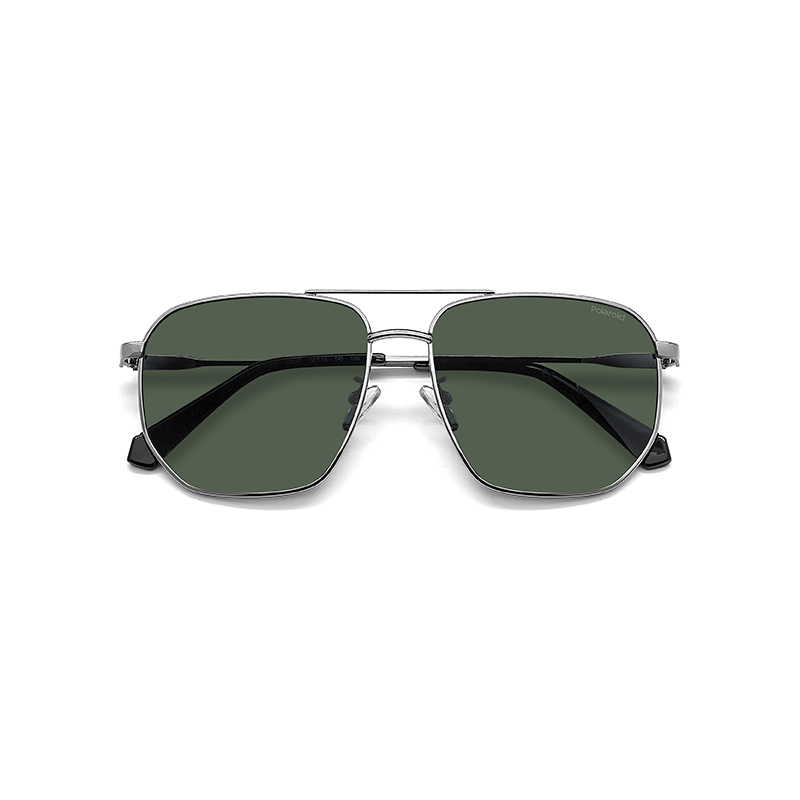 El frente geométrico de estas gafas de sol de Polaroid de hombre presentan un doble puente y apoya en almohadillas ajustables. La montura metálica puede llevar lentes graduadas, y fluyen en las varillas personalizadas con un elemento de color, y terminales tono sobre tono.