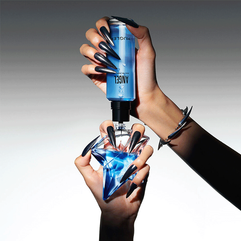 Diseñado por el propio Manfred Thierry Mugler, el frasco de perfume Angel debe su singularidad a una cristalería tecnológica e innovadora. Símbolo universal, la estrella es la encarnación de los sueños en la vida real, de un mundo infinito al alcance de todos, de las infinitas posibilidades en la palma de la mano.