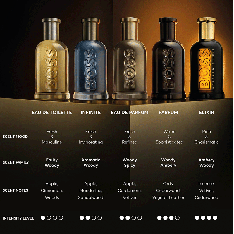 BOSS Bottled Elixir ofrece una explosión de masculinidad atrevida y cautivadora con ingredientes de lujo en altas concentraciones, con notas de salida de incienso cálido y cardamomo, corazón de vetiver y pachulí, y notas de fondo a base de esencia de madera de cedro.
